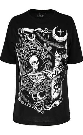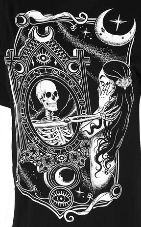 A game of Bloody Mary stripped barer than any could ever imagine! A skeleton (friend or foe?) reaches out to a shocked maiden through a mirror modelled after Restyle's signature Fortune Teller Mirror. The couple are surrounded by a night sky and elegant border.