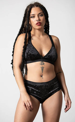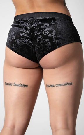 Add a sporty spice to yer lingerie with the Moody Panty! Made from super strong, stretch velvet, these panties are embossed with wicked patterns and sit securely on yer hips with a wide waistband.