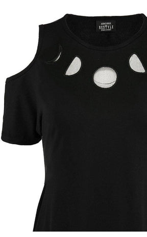 Hey, moonchild! A magical black oversized tunic featuring cold shoulder cutouts and mesh moon phase insert. Wear as a dress or oversized top. Perfect paired with fence net tights or leggings.
