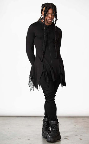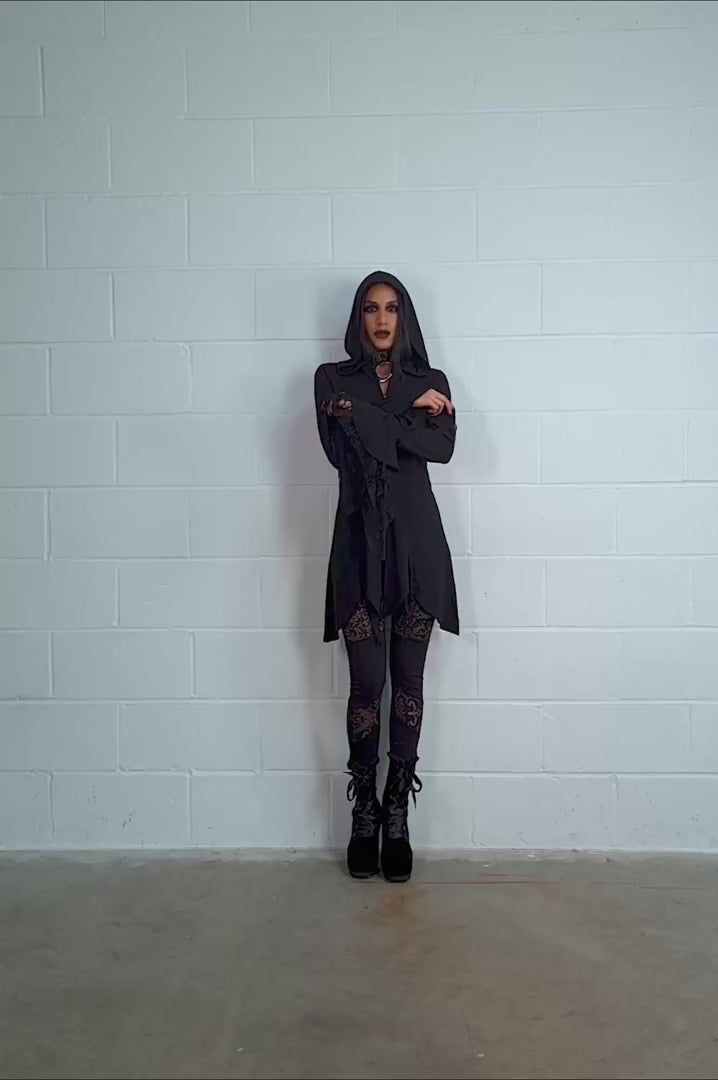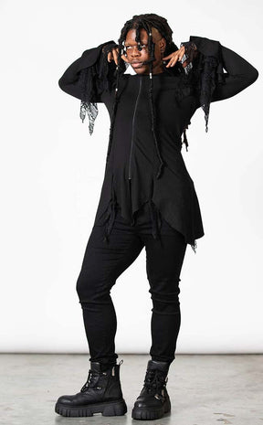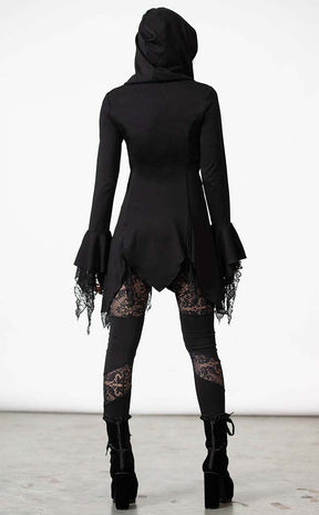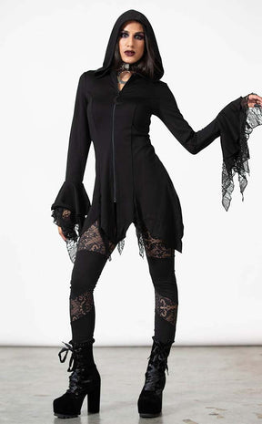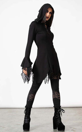 Step into lunar light in the Moonzone Long-line Zip Hoodie. Soft, stretch fabric forms this fitted winter warmer, featuring bells sleeves with lace inserts, an oversized hood, a hanky hem and a full-length zip with a cute crescent moon pull.