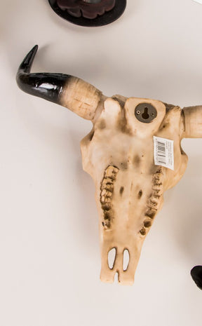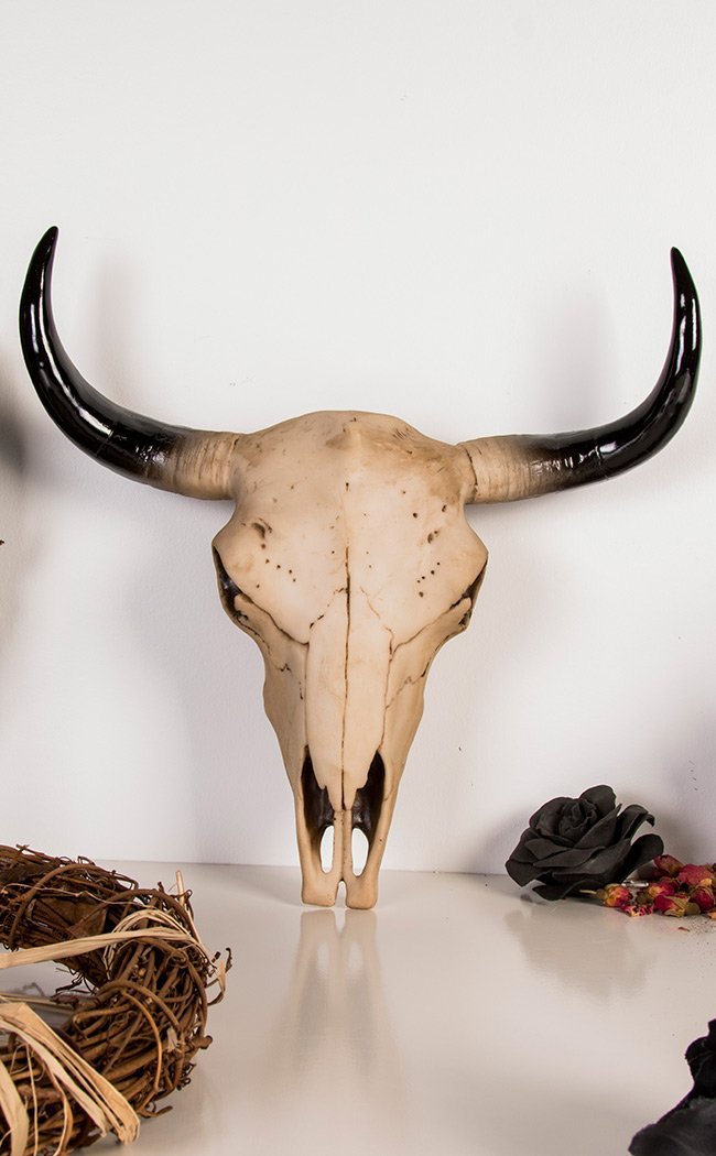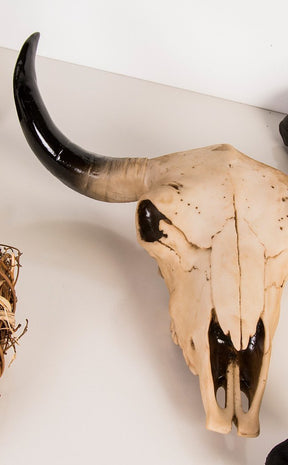 A monument to the inevitable doom all creature's share. The horns of this cow's skull are blackened as if it attempted to charge blindly into the darkness in life. The skull itself seems bleached by an unforgiving sun, cracked and marked by the elements.