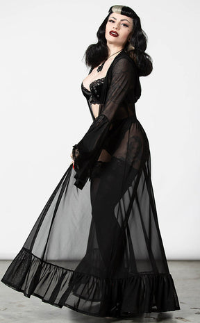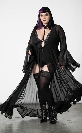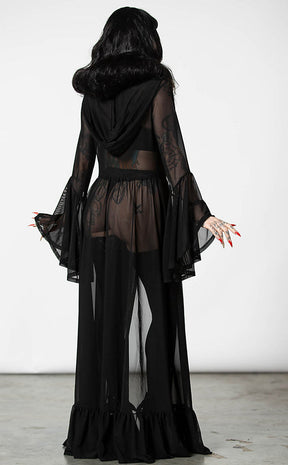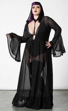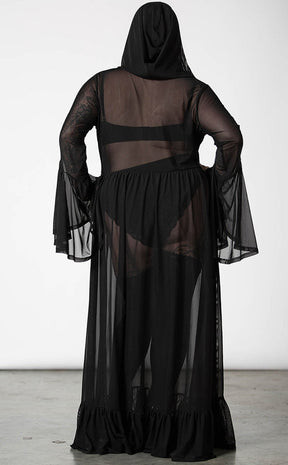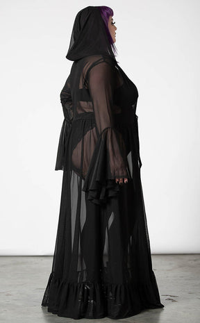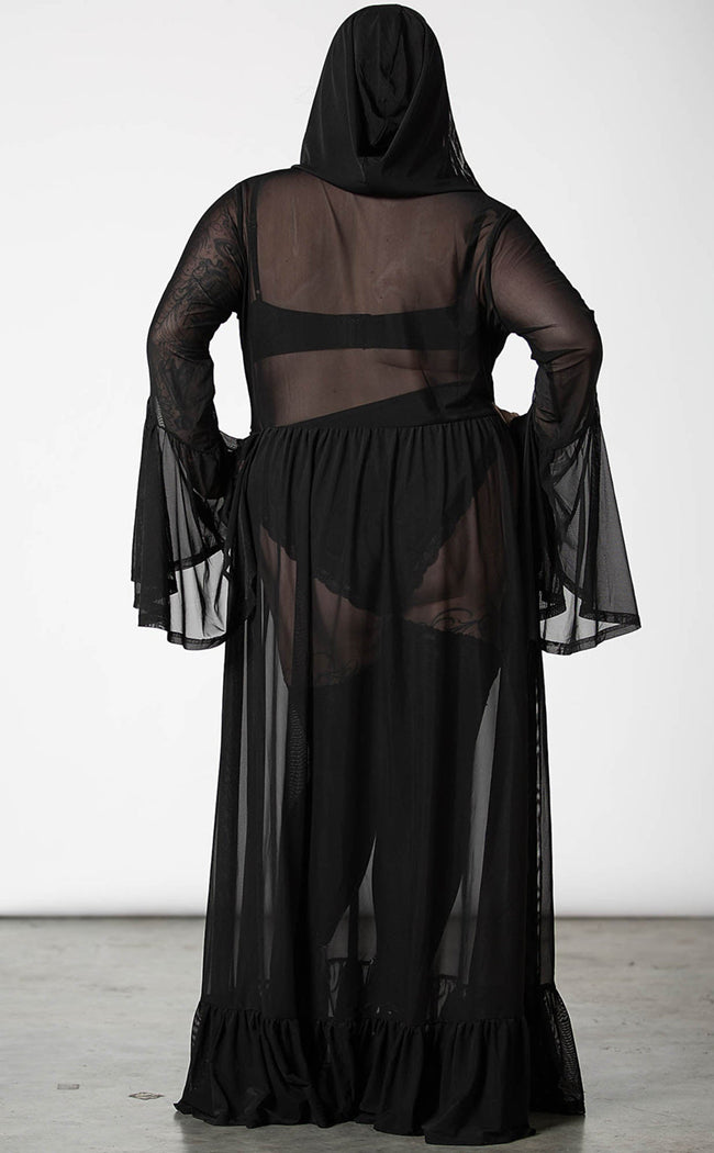 Cloak yourself in shadows in the Mother Spirits Hooded Cloak! Made with soft, flowing mesh, this cloak features gathered waterfall sleeves for dramatic gesturing, an extra large hood to create an aura of mystery and a waist tie to cinch the relaxed fit of the cloak as you need.