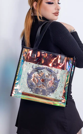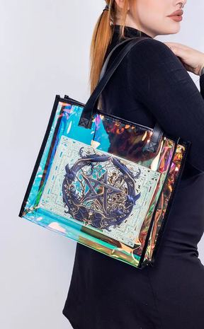 Carry your goodies around in style with this Mystic Lilac Holo Shopping Bag! It's the perfect accessory for your witchy wardrobe, and its comfy black straps make it easy to haul around. This bag features a beautiful pentagram design in a deep purple shade, and will be sure to have the other covens green with envy!