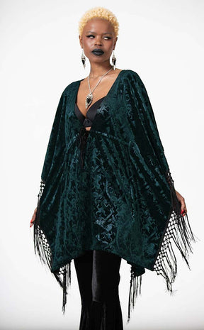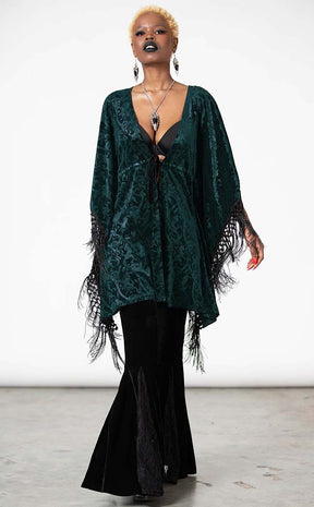 Complete your outfit the right way with the Mythic Mind Kimono. Soft, stretch velvet is embossed with an elaborate beast print, forming this relaxed fit kimono. The sleeves are trimmed with a tassel fringe and the kimono secures with a tie front.