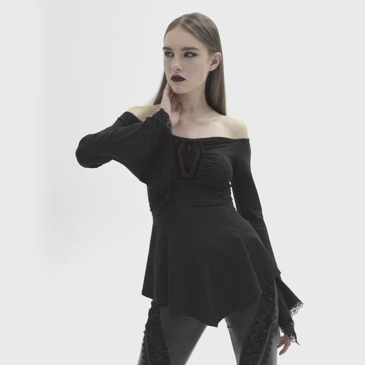 Bring out yer vampire glamour in the Necromantic Bardot Top! The neckline and flared sleeves are trimmed in lace, complementing the dead-fancy tone set by the velvet coffin inset at the chest, topped off with a cross charm. The top fits close at the waist and flares to an asymmetrical hem, flattering your flesh prison beautifully,