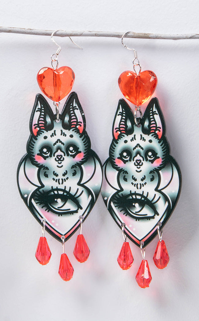 Get a clear view this moonlit night! The Night Vision Chandelier Earrings are the most adorable accessories a vampire could ask for: heart-shaped bats feature piercing eyes on their fluffy tummies, dripping with blood gems and crowned with a matching heart. Add some gothic drama to your look in a snap!