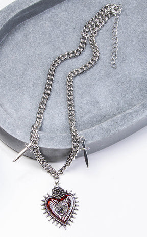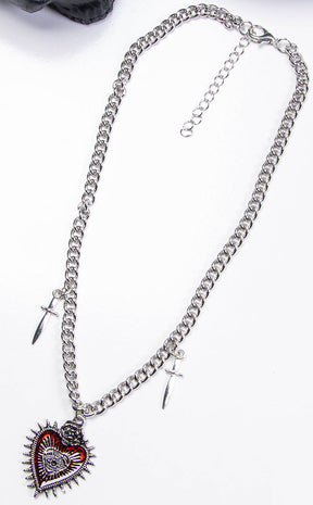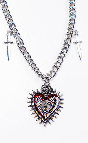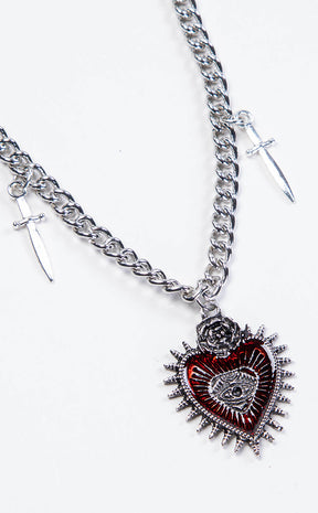 Armour up in the Not So Sacred Necklace! A sacred heart charm crowned by a rose sits on a short chain, trimmed with dagger charms to have you feeling cute and dangerous.