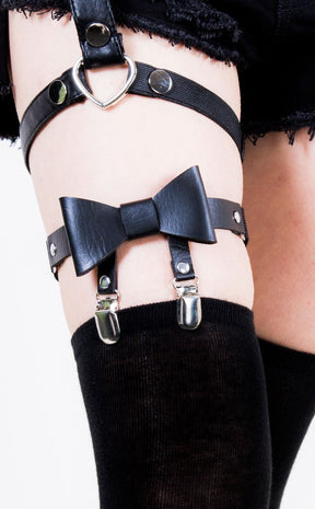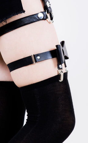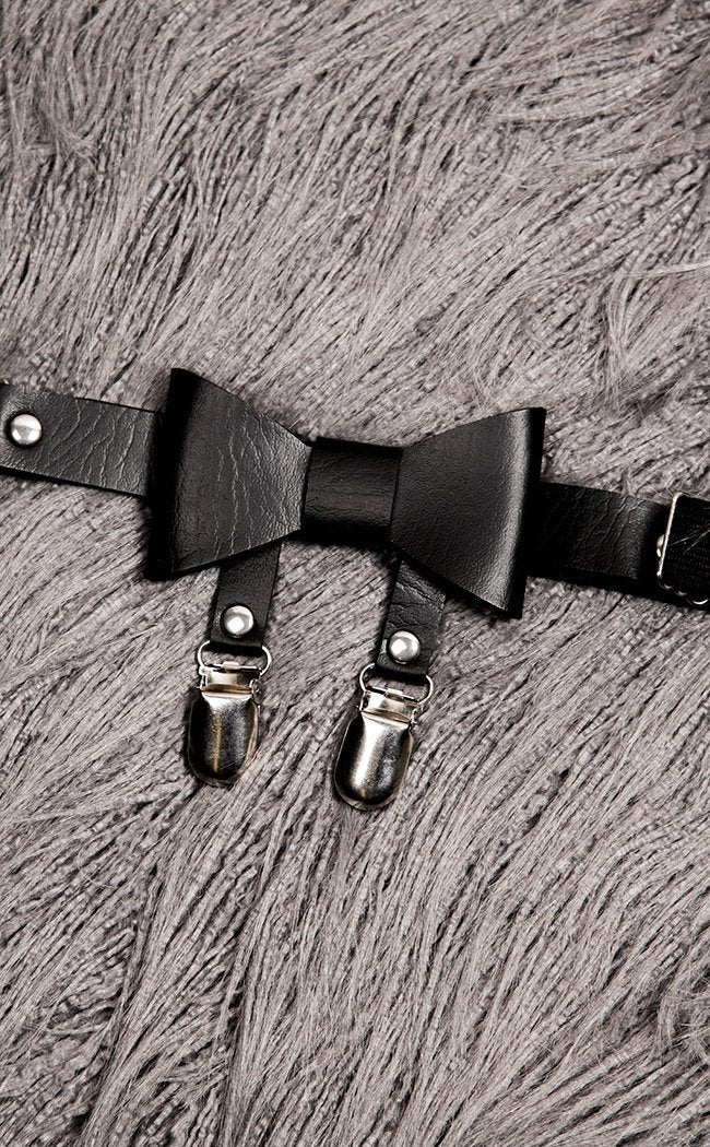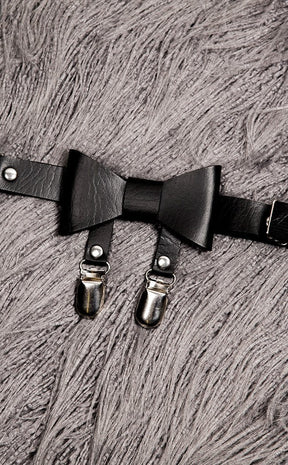 Gothic lolita garter with faux leather bow and elasticated back. These garters have two clips at the front to attach to stockings and are adjustable so can fit a variety of sizes.