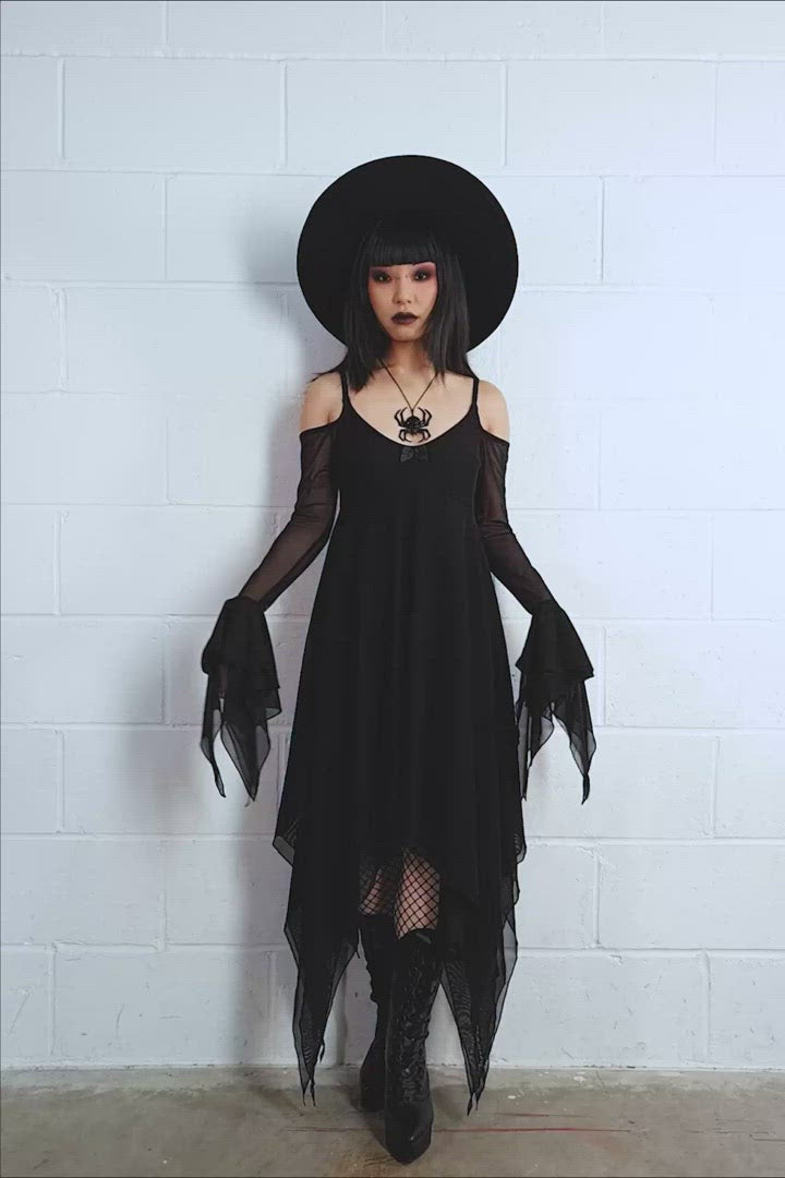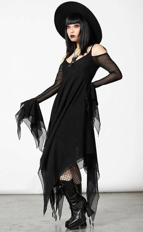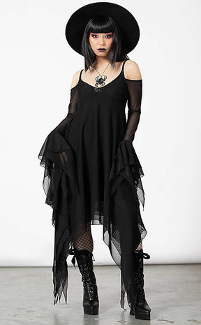 The Omen Crush Dress is the spectral statement piece of your witchy dreams! Soft, stretchy fabric forms this cold shoulder dress and a flowing skirt with a hanky hem. Mesh forms dramatic layered bell sleeves, completing the look that'll have you lookin' like a living shadow.