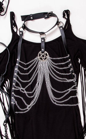 Get yourself decked out in Cenobite chic! Vegan leather straps form a choker and buckled waist strap from which two curtains of chains hang across the chest. A pentagram sits directly over your heart, so you know your soul belongs to the damned.