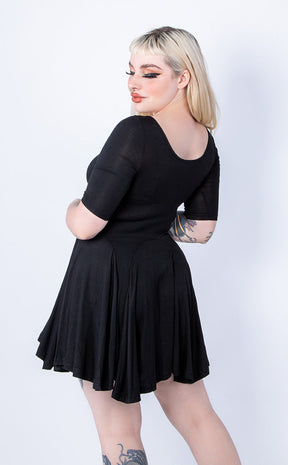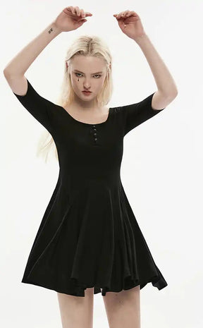 This dress is made from the most comfortable and stretchy lightweight material. The flattering fit and flare style makes this dress just perfect for throwing on in a hurry and looking like you've spent hours getting ready. Featuring a round scoop neckline with a row of skulls-shaped decorative buttons