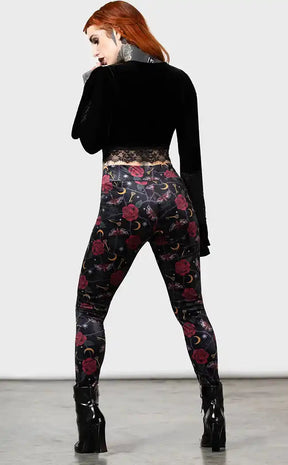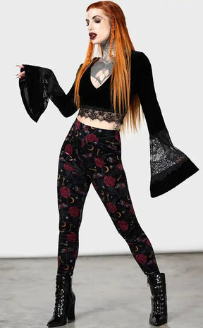 For the Hedge Witch in your soul. Cottagecore meets witchy goddess in these romantic soft velvet leggings. Featuring a gorgeous custom print with lavish roses, moons, keys and moths.