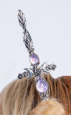 This extra long hair stick has ornate, details of a triple moon symbol, a pentagram, and other scrolling designs which surrounded two light purple gems. All these sit on a hair stick in the shape of a longsword, which you can use to keep your hair in an easy bun.