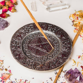 Round, silver metal incense holder and burner perfect for your witches altar!