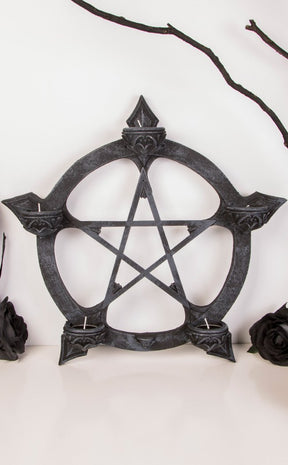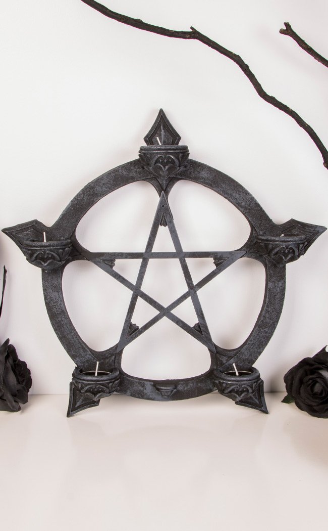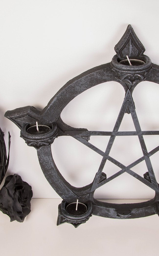 A magickal sconce to light the way for guests and good energies. An upright pentagram is cast in dark painted resin to look as if lifted from an ancient place of power, a holder for tealights placed at each point.