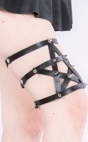 Kick it up a notch with this pentagram leg harness garter. It is made from quality PU leather covered wit silver spike studs. It has wide soft elastic at back which is adjustable for the perfect fit.