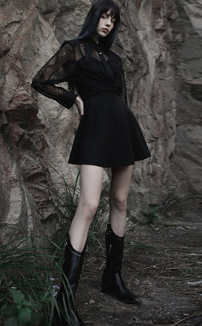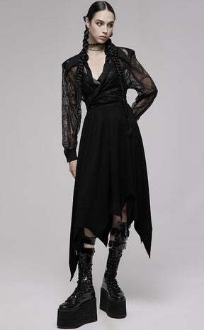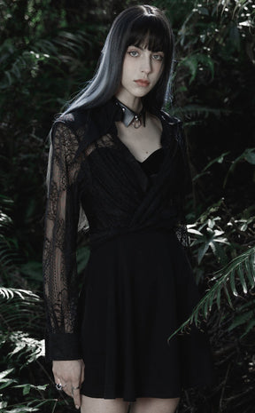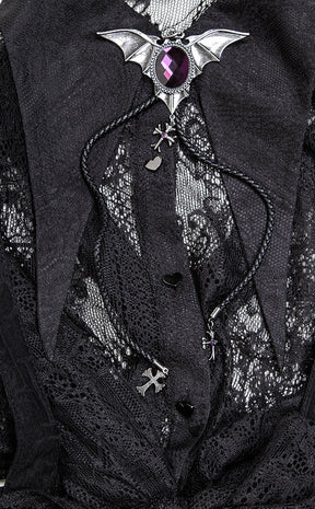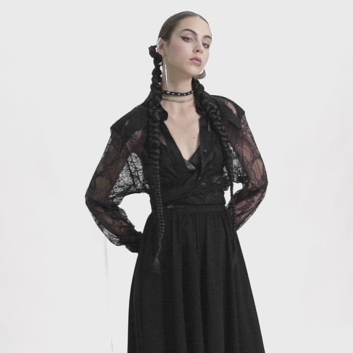 Add some funeral chic to any outfit with the Perdita Lace Overshirt! Victorian lace fits loosely over your body in this long sleeve shirt, finishing at your natural waistline to create a flattering figure along with the shoulder pads. The waist tie and exaggerated collar will have you feeling like a professional widower, all trimmed with cute heart buttons.