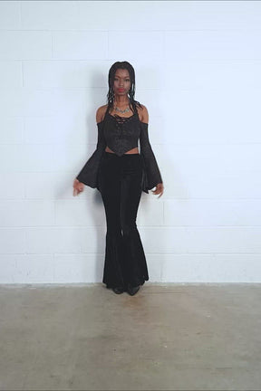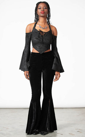 Look bewitchingly beautiful in the Periwinkle Halter Crop Top. Soft, faux suede forms this halter top, featuring dramatic bell sleeves, a lace-up neckline and a cropped V hem. The fabric is embossed with intricate patterns, great for dressing up or down for any occasion.