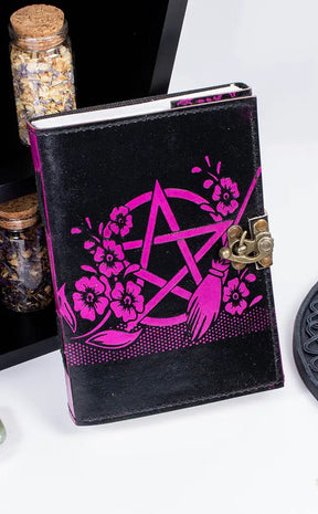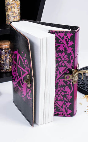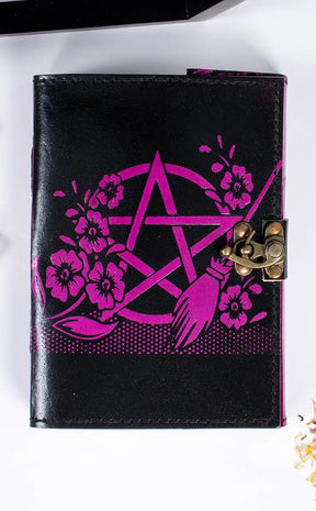 Bound in black and pink leather, the cover is embossed with the image of a large pentagram with witchy flowers and a broom. Inside, high-quality lined paper will keep your thoughts, ideas and dark desires neat. The spine has a woven cord and the book opens and closes with a sturdy brass metal lock. This is the fattest book with the most pages - it is 3cm thick!
