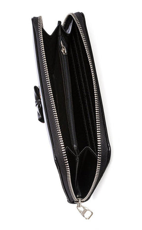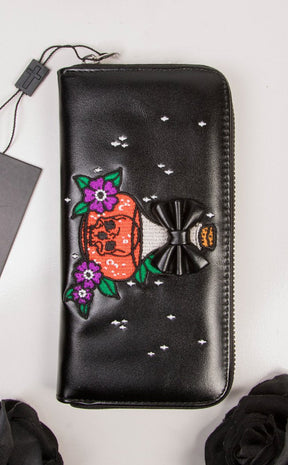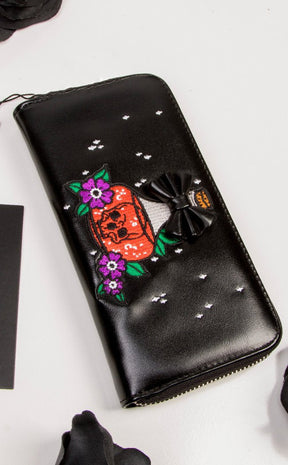 Bring a magical touch of colour to yer cards n cash! A deadly concoction is embroidered onto the front of this wallet, surrounded by flowers and sparkles and topped off with a faux leather bow. The wallet opens with a zip, revealing a zipped coin compartment and plenty of card slots.
