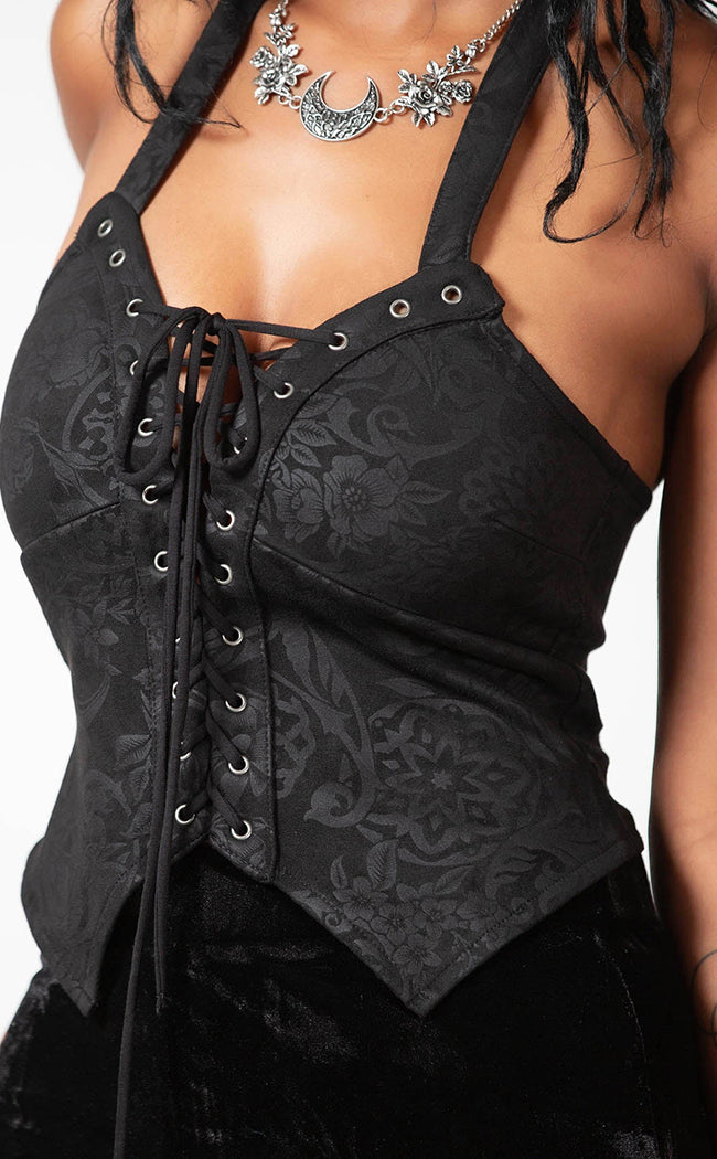 Get yer bitchin' bodice on with the Prinna Lace Up Vest! Soft faux suede forms this halter top, featuring an adjustable lace-up front, an adjustable halter neck and statement embossed patterning.