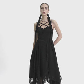 Step out in the bewitching beauty of the Pyre Proof Dress! This elegant slip features a strappy pentagram formation at the chest, connecting to adjustable shoulder straps and a sweetheart neckline. A fitted waist leads to a flowing skirt with 3 layers of lace that flow beautifully with each step, ending in tatters to show that you're unburnt, unbroken.