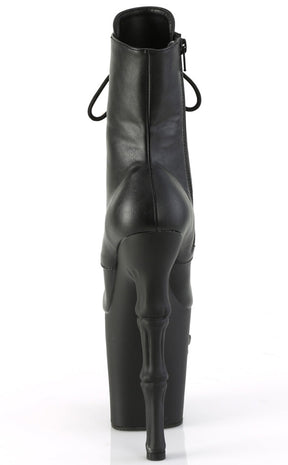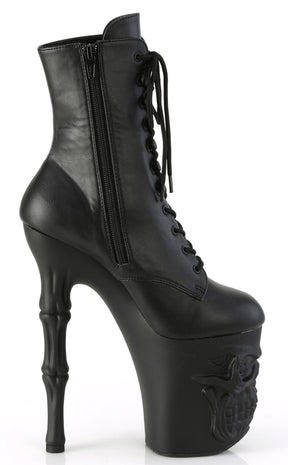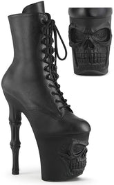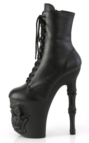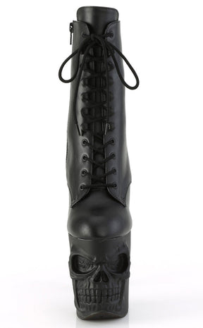 Become yer own reaper in the RAPTURE-1020 boots! These boots feature a black matte upper that secures with a lace-up panel and inner zip. The platforms are the real showstopper, featuring a grinning skull and fingerbone heel in a matte black finish.