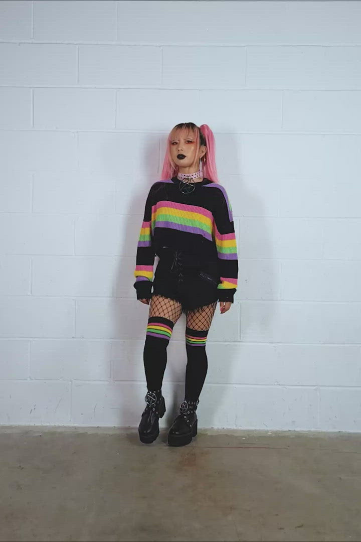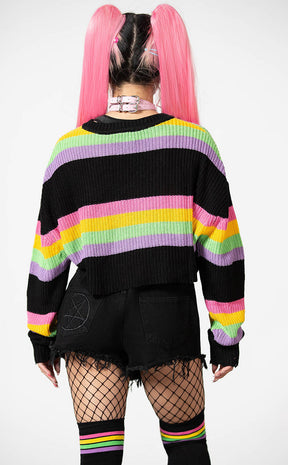 Get cute n' colourful in the Regenboden Knit Crop Sweater! Soft, stretch knit forms this relaxed, cropped sweater, decked out in rainbow stripes, distressed details and a round neckline.