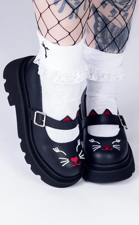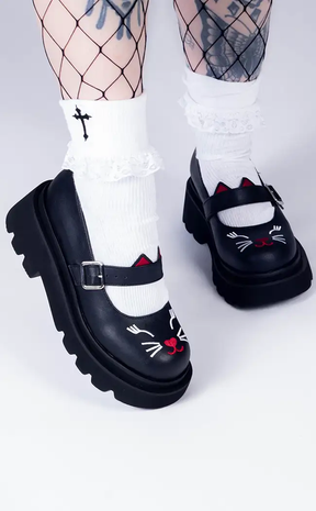 Say "meow" with the RENEGADE-56 Mary Janes! These cute flats feature a happy cat face embroidered on the toe, complemented by the buckled strap trimmed with cat ears. Pair with frilly socks to let 'em shine in the spotlight!