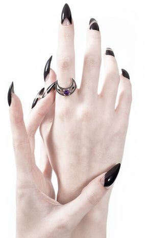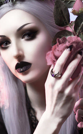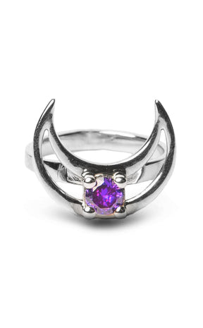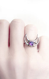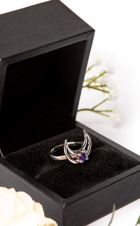 Show your true self to the world with the Rhea Ring. This gorgeous ring is in the shape of an inverted crescent moon, adorned with a glittering amethyst coloured gemstone.