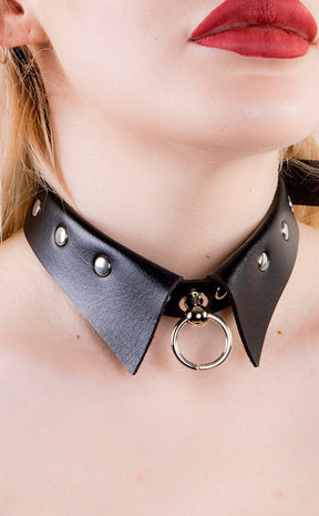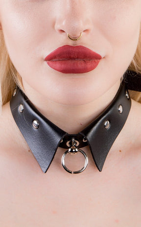 Corp Goth with a bit of a kink. This choker has a super cute collar style, complete with studs and a O ring so even the most punk of us can dress up and get down to business.
