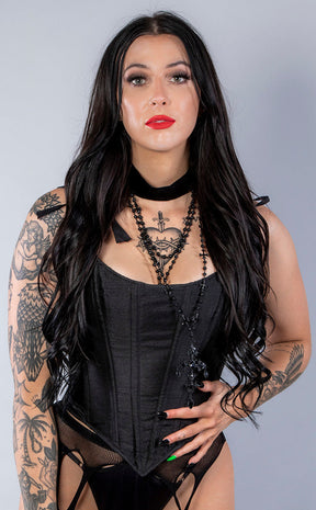 The Rosalind Bustier is effortlessly sexy, bringing classic style back as seen through the lens of pure darkness. Steel boned to keep shape and provide support, this classic bustier shape is made with soft, smooth silk; forming a pointed hem and two shoulder straps that can be adjusted with a ribbon tie. The back of the corset comes with a modesty panel behind the lacing that can be folded away according to your wear preference.