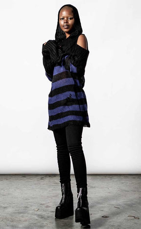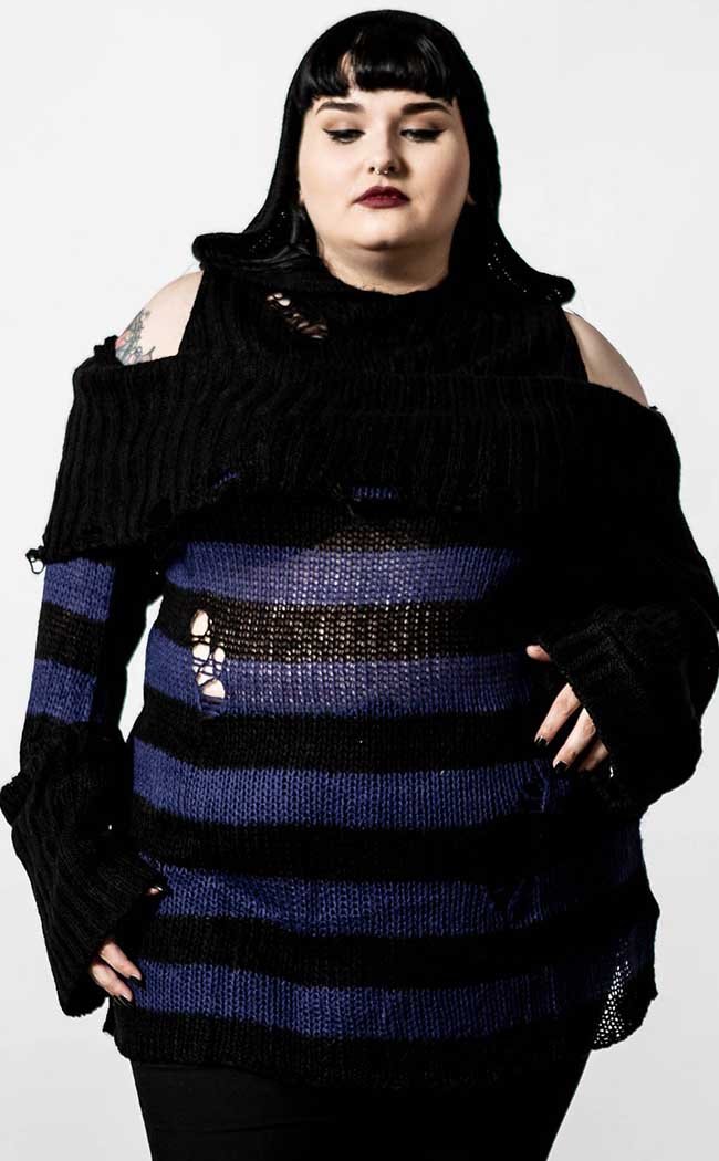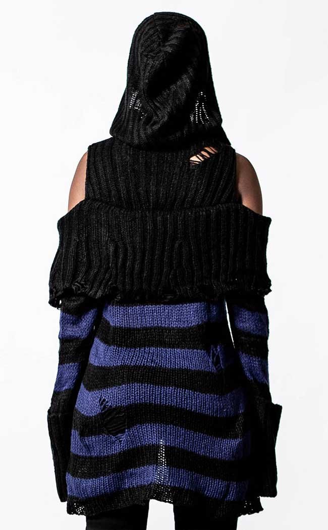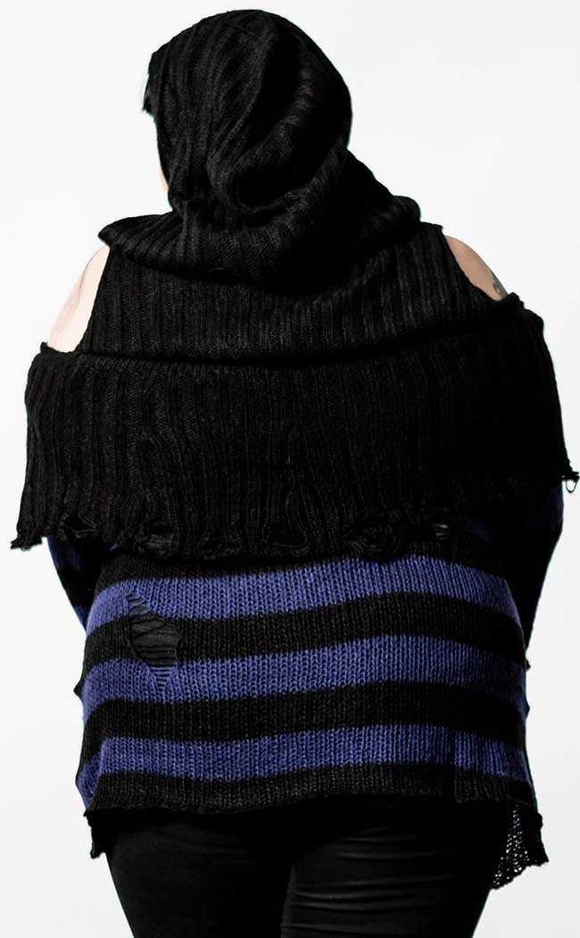 Get snug in inky stripes with the Sapphire Hooded Knit Sweater. Super soft and totally vegan, this knit wraps you in a statement bardot neckline and cosy hood. The blue and black stripes feature shredded details to get ya feeling extra badass, fitting over yer bod in effortless warmth and style.