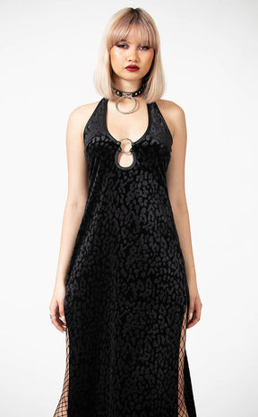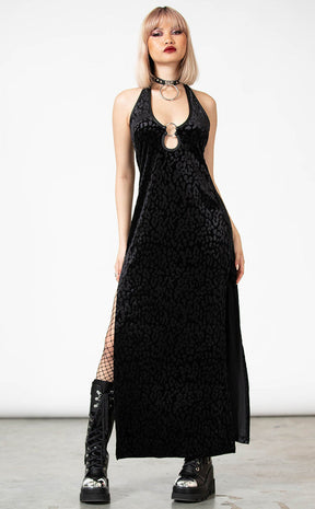 Show yer wild side in the Second Skin Maxi Dress! Soft, stretch velvet embossed with a black-on-black leopard print forms a halter neckline, a long, split skirt and a cutout scoop neck decorated with an O ring.