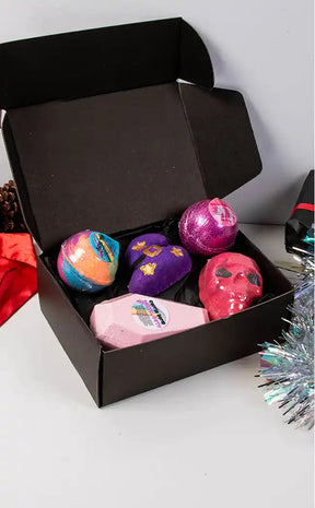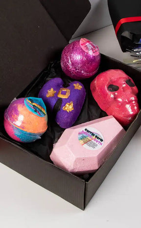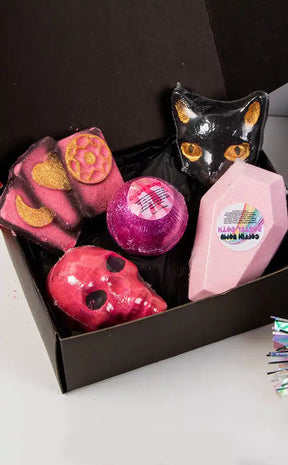 This box is a beautifully packaged selection of 5 handmade vegan bath bombs. The twist? The contents are a surprise! Each box is guaranteed to have a different combination so you can sample each scent we have available, from sweet bubblegum and grape to sensual nag champa and musk. You may even find one of our bleeding skulls or coffin bombs! Each box will get one new unreleased bomb as well!