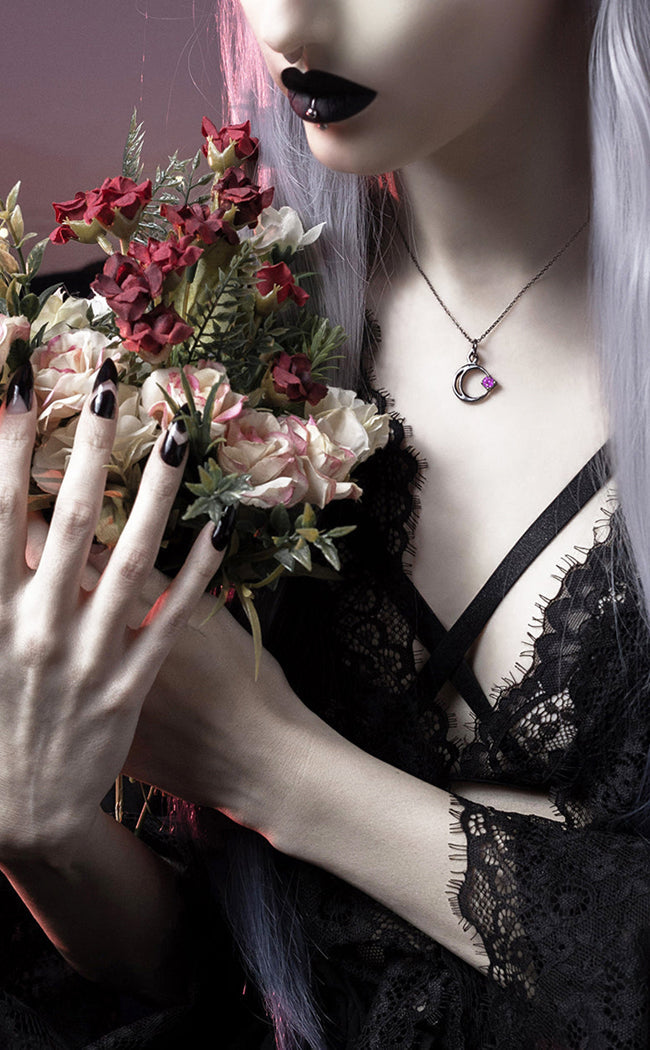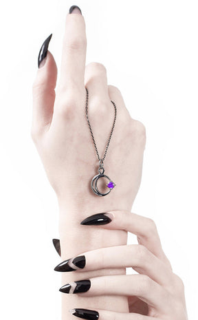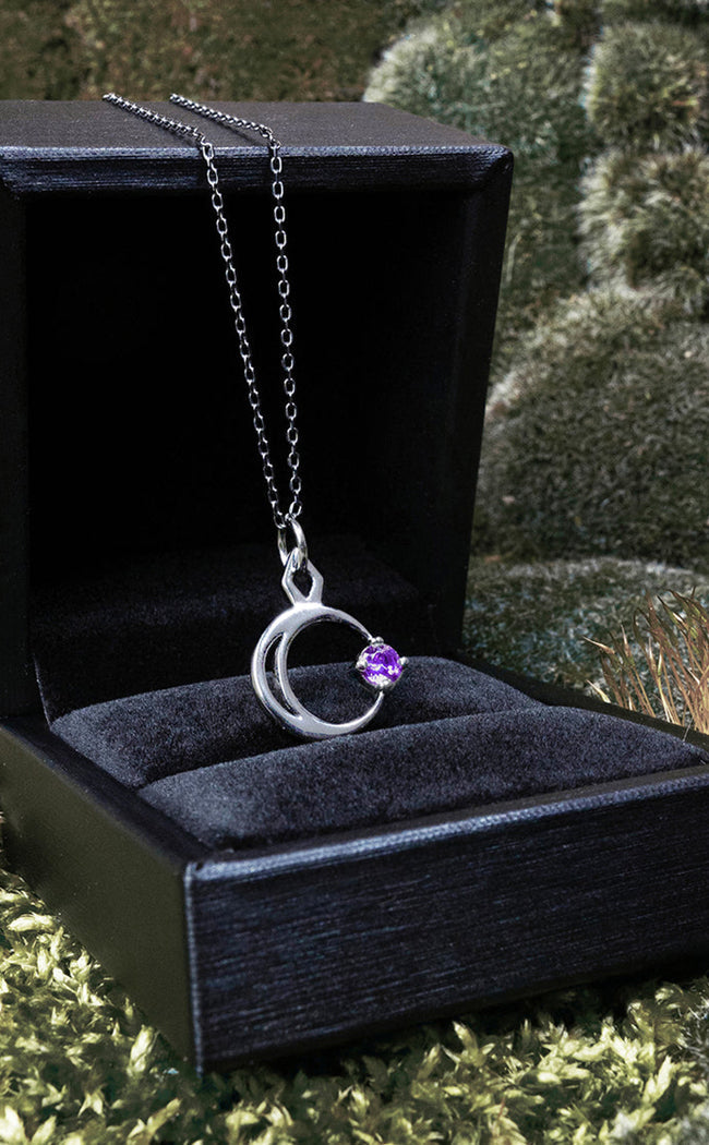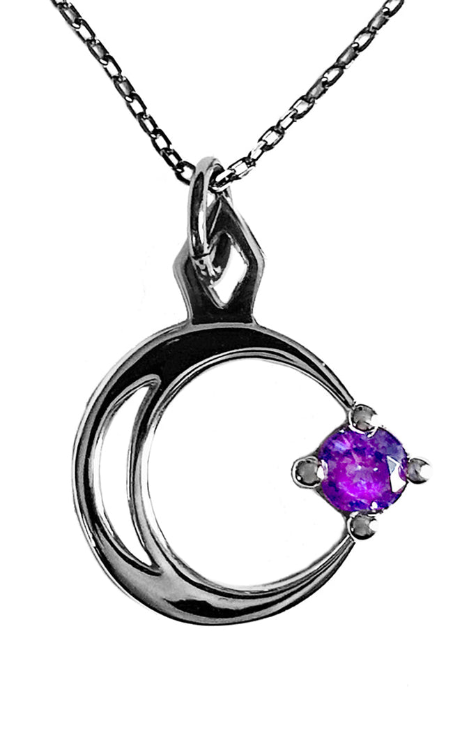 Wrap yourself in cosmic energy with the Selene Necklace. A shining silver plated chain holds this shining pendant, shaped after a crescent moon gently carrying a violet toned star on its path.