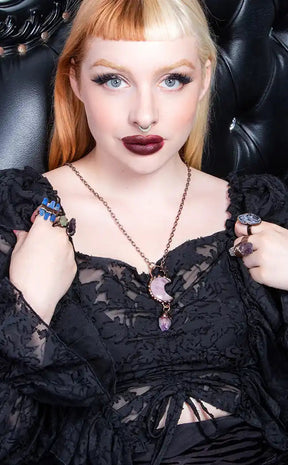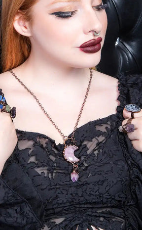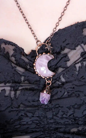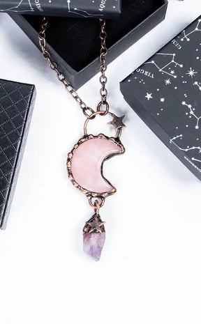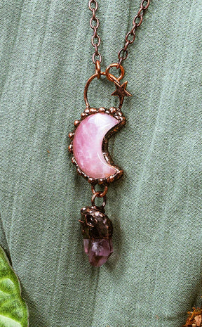 The Selene Necklace is made from a beautiful crystal that has been hand shaped into a crescent moon and polished. Each pendant has been framed in bronze with a star affixed above. Below the main crystal, a smaller crystal point hangs with another star charm. The necklace secures with a large arch and includes a 70cm long antique bronze chain. These necklaces are hand made and each is beautifully unique.