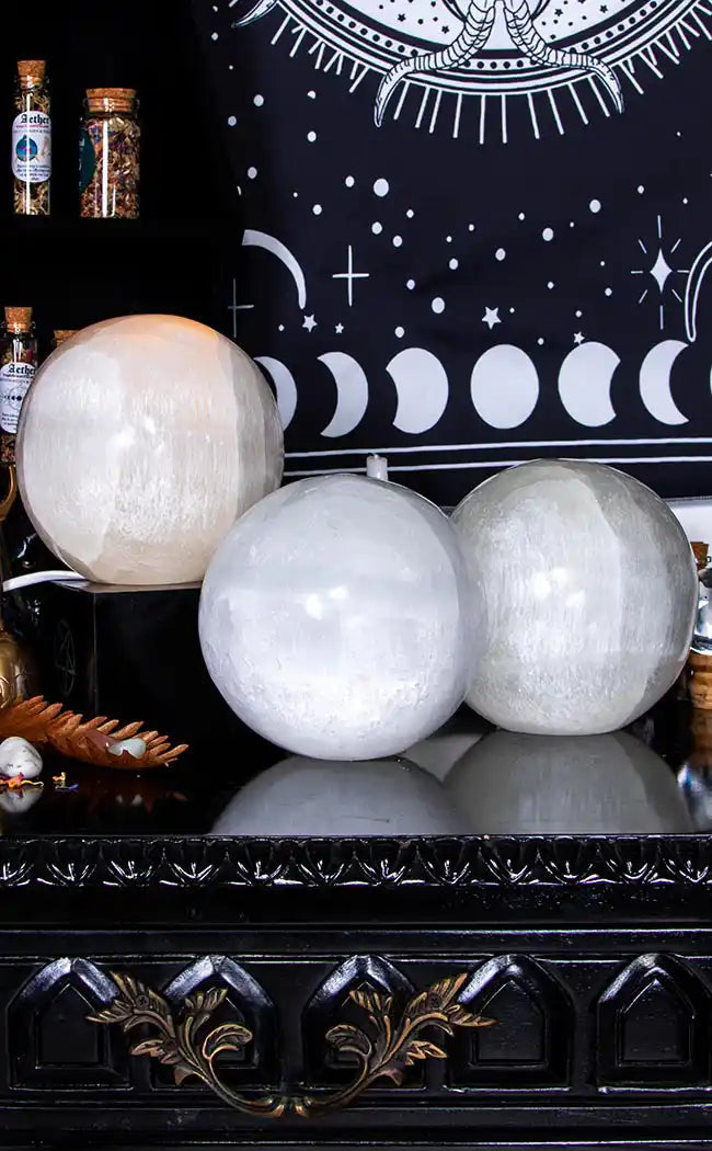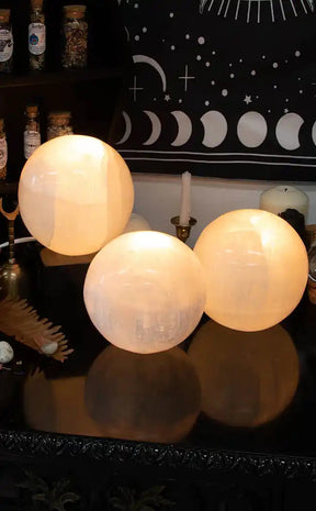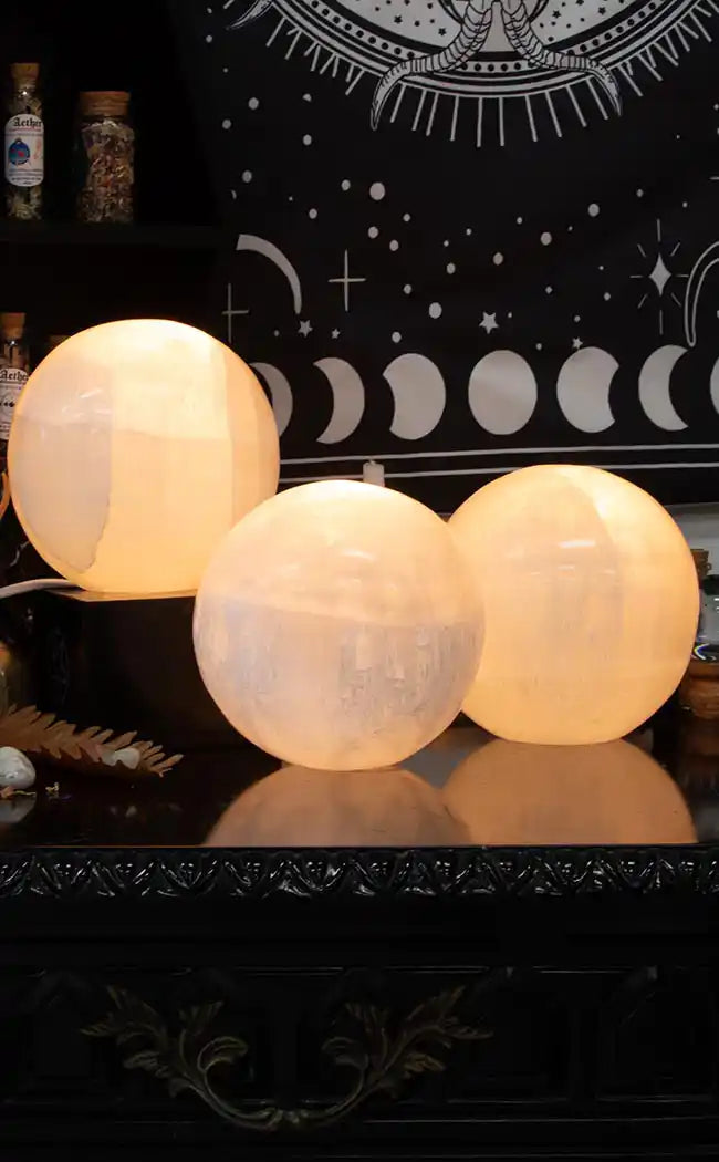 These beautiful lamps are made from solid pieces of Selenite that have been carefully crafted into a sphere by hand and beautifully polished. They look like a glowing representation of the moon and emit calming, healing energy with their light.