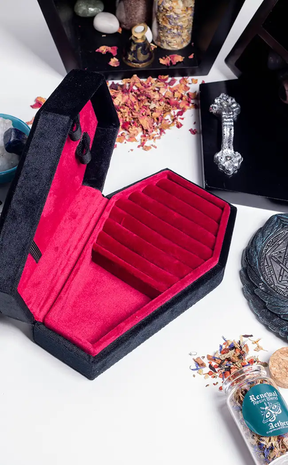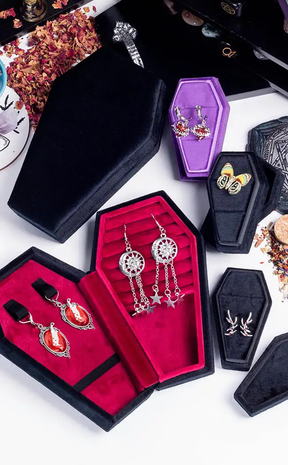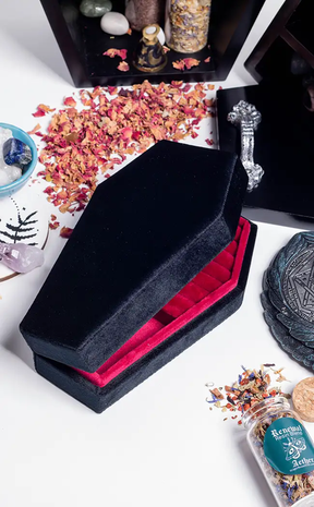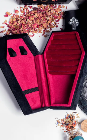With a hinged lid and luxuriously-hued deep crimson velvet interior, this statement casket jewellery box is a gorgeously goth way to display your fave jewellery pieces. This fully lined box features multiple cushioned ring compartments and a plush necklace tray.