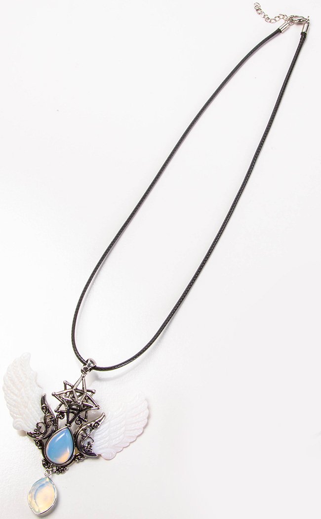 Cloak yourself in the essence of a divine being. This statement pendant features two pearly white angel wings stretching out from a teardrop-shaped moonstone crystal fixed in intricate silver findings. A matching faceted pendant hangs below the set. The wings are crowned with a geometric star, creating a beautiful piece that will cast heavenly light on plunging necklines.