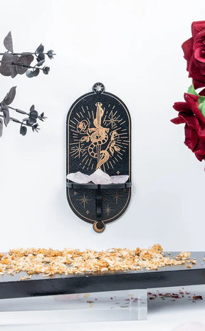 This shelf features enough space to show off your fave trinkets and crystals - and even comes with notches for hanging necklaces or pendulums.