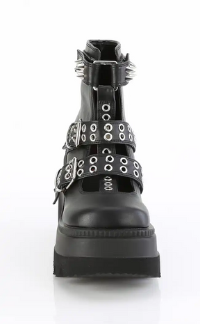 Featuring a cage bootie design, these boots are sure to turn heads. The double grommet buckle straps and spiked top strap adds an extra touch of punk rock to your outfit, while the sleek black colour ensures that they are versatile and perfect for any occasion.