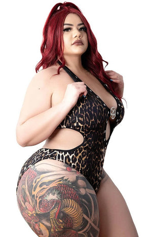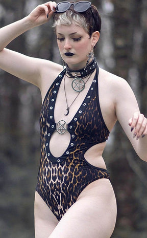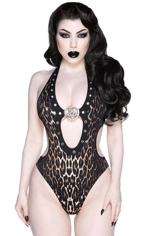 Can anybody say mee-owch? Look like a wild child in this monokini: sexy leopard print is bordered with black eyelet trims. A chunky silver look pentagram sits at the chest to pull together the plunging neckling, so all the beachgoers know you're a hellcat not to be messed with!