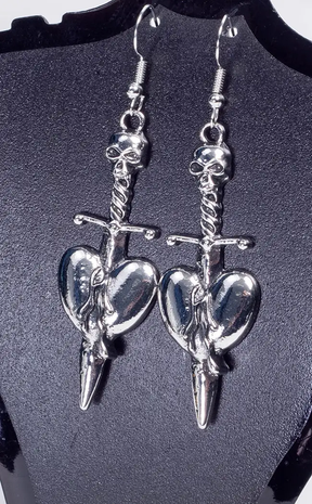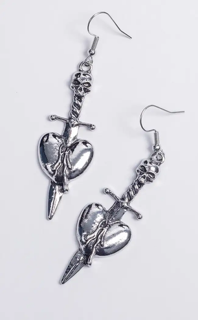 Fall in love with our Shot Through The Heart Earrings! Featuring a heart impaled by a sword with a skull on top, and blood dripping from the heart, this edgy accessory will captivate the hearts of those who encounter it.