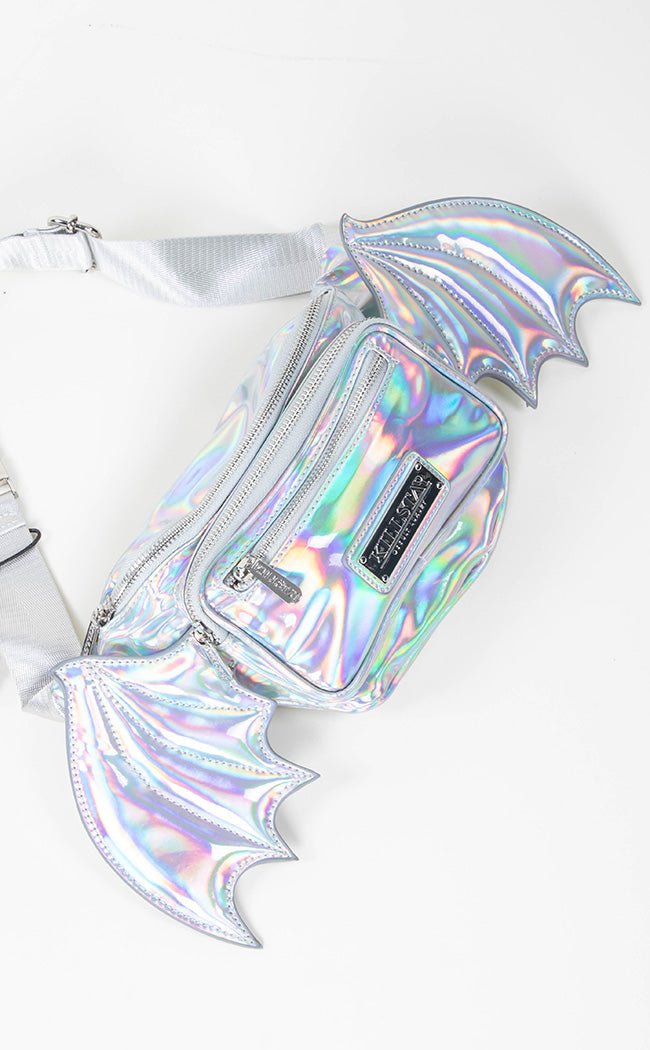 Grab your sh*t and go with this holo statement piece! Both the main compartment and front pocket secure with zips, so you can thrash and flail without losing yer trinkets. Two shining bat wings spread out from the sides so you can slip this baby on and fly the day away.