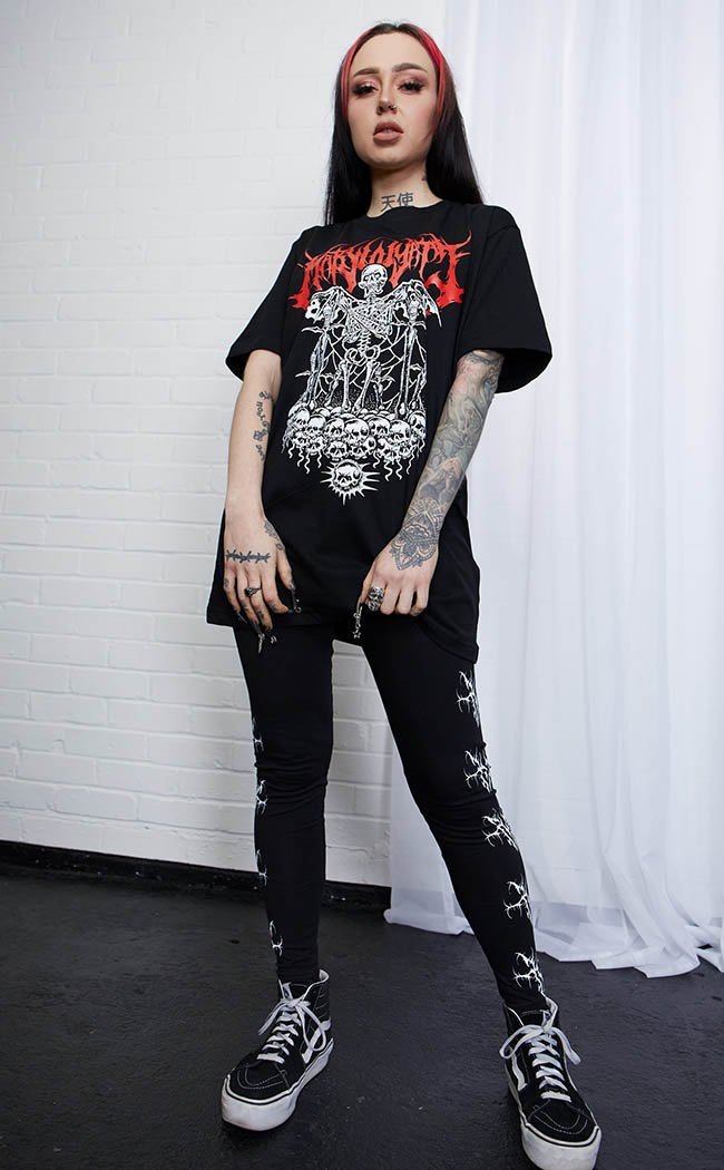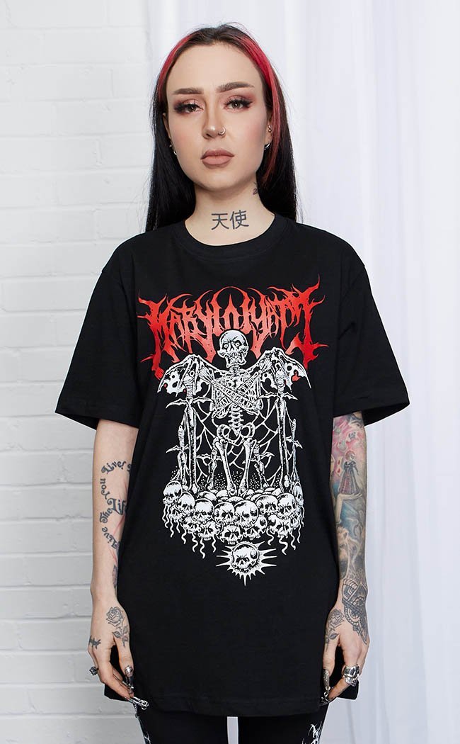 The reaper sits atop his throne of skulls to remind us that no one can escape their eternal slumber with Mary Wyatt printed in blood red font above. The tee itself is an oversized fit for those who prefer a looser, more casual silhouette.
