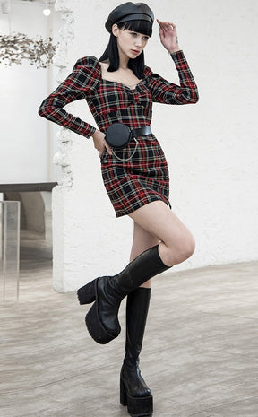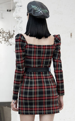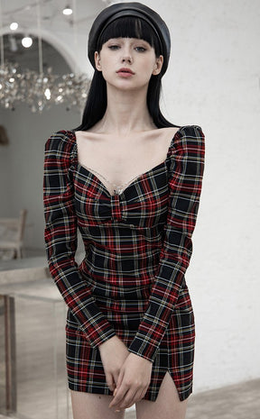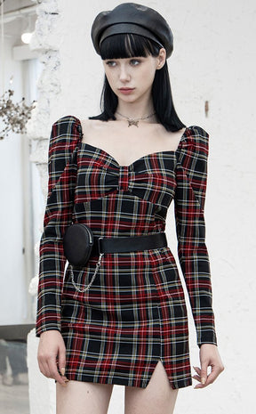 Put a lil plaid in yer fancy threads! This gorgeous dress has a deep, sweetheart neckline bordered with puffed shoulders and long sleeves. The rich, deep red tartan fits at the waist and ends in a mini length hem, perfect for wearing alone for warmer months or dressing up with stockings in winter.