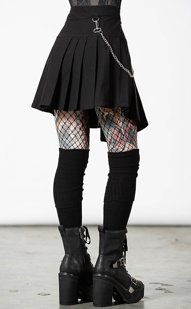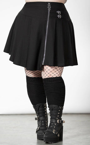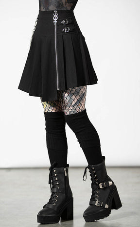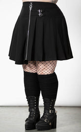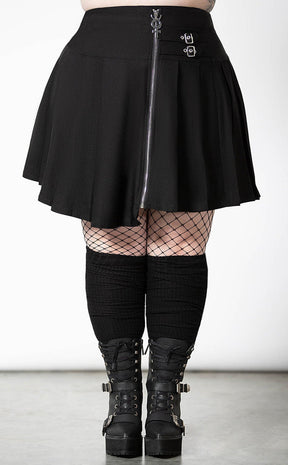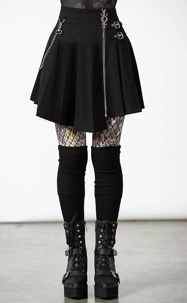 Become your own cosmic entity in the Space Wave Mini Skirt! This cute pleated numbers was plucked from the cosmos, made with soft stretched fabric into an asymmetrical fit along with celestial trimmings like buckles, a full front zip, a removable chain and a Mercury glyph charm.