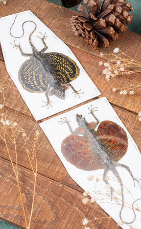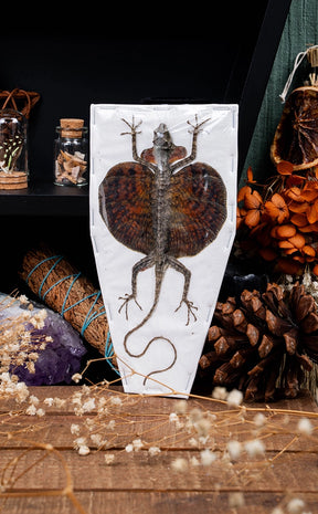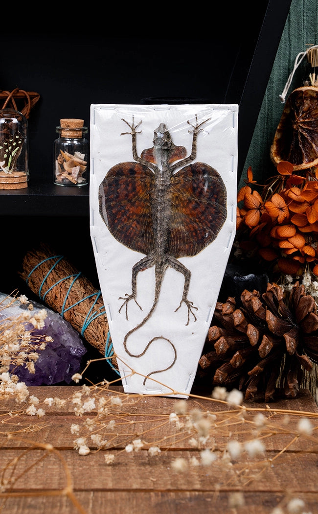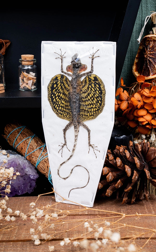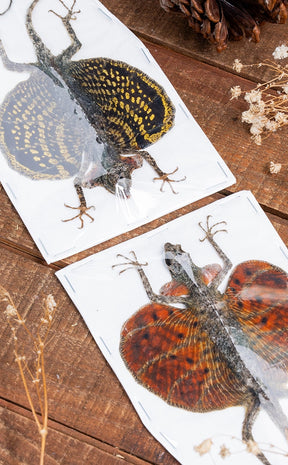 The striking lizards are beautifully preserved. Draco haematopogon, the yellow/red-bearded flying dragon. These genuine lizards have been dried and preserved, then placed into a packet to protect them.