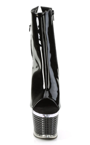 You're a one-woman show, baby! The SPECTATOR-1018 ankle booties feature a vegan black patent upper with a peep toe, ankle cutouts, rear lace-up and side zip. The heel and platform are topped by a clear panel above a 3D stud look wrapping.